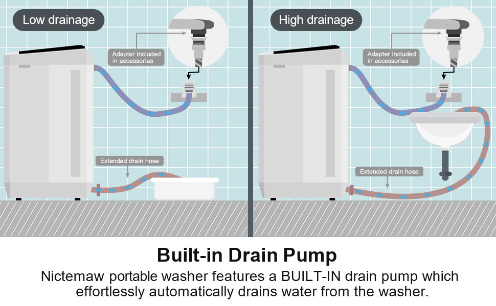 Answer:Yes, the machine has a built-in drain pump and is equipped with an extended drain hose, which can help you drain dirty water more easily.