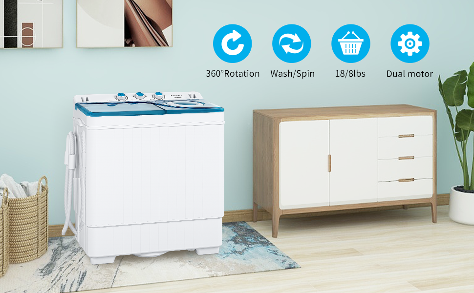 🛒【Large Capacity】You can operate washer or spinner separately, and you can also run two sides on the same time. The two tub design can meet your different needs. Total capacity:26lbs(washer:18lbs,spin cycle:8lbs), for doing light to medium laundry loads.