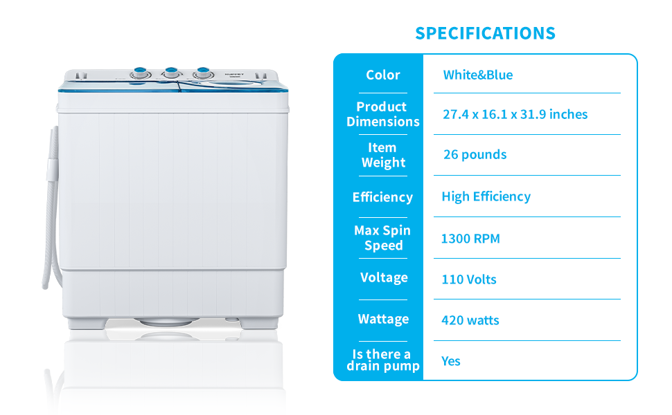 🥼【Washing Capacity & Specifications】Total capacity:26 lbs(washer:18 lbs, spin cycle:8 lbs). Overall dimensions: 27.4* 16.1* 31.9 inches. Power supply: 110v/60hz, Total power: 420w(wash:280w/dry:140w). Easy operation design and easily movable.