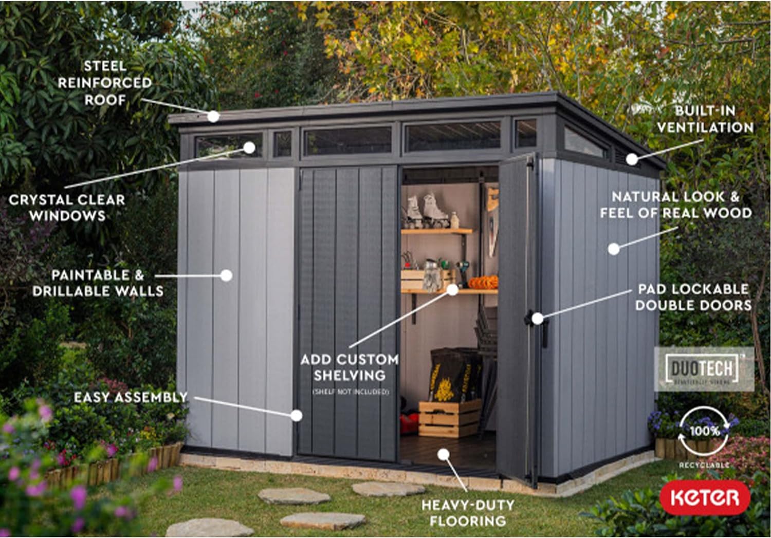 Uniquely Yours: Customize your shed with its Duotech walls that can be painted, drilled, and modified to accommodate shelves, hooks, and more, tailored to your specific needs.