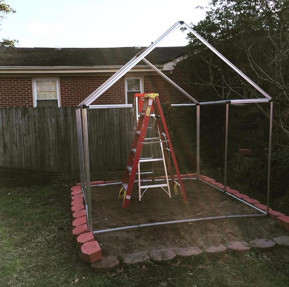 Answer:The actual measurements if the greenhouse is roughly 6.2' W x 8.3' D. If you are able to assemble it in a larger space such as a garage, driveway, etc. you can build it there. You would need to have the foundation and base frame anchored, then enlist a couple of people to move the assembled greenhouse to the foundation. The weight of the assembled greenhouse is 119 lbs.