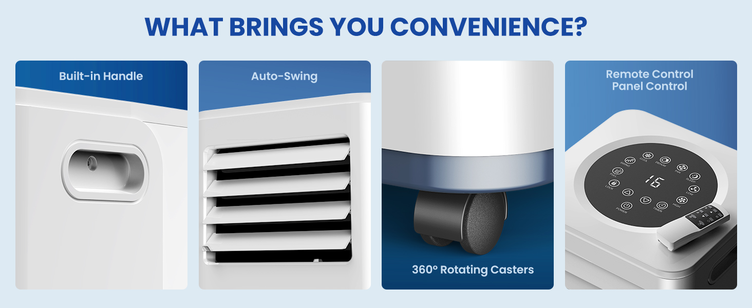 • 🆒【Smooth Move & Effortless Assembly】This air conditioner is designed with two built-in handles and four 360° casters for room-to-room mobility effortlessly in bedroom, office or in the cabin around your home. We offer window kits that are compatible with most sliding windows, catering you an effortless installment without drilling. And our unique plug design behind simplifies storage and transportation of the air conditioner.