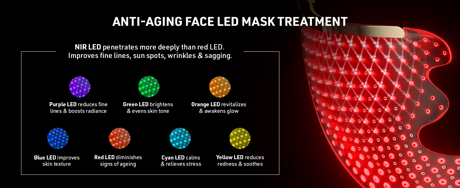 FULL SPECTRUM LED MASK LIGHT THERAPY 8 LED wavelengths, including NIR & red light therapy, tackle aging, blemishes, hyperpigmentation, lines & wrinkles, irritation & dullness for a youthful glow.