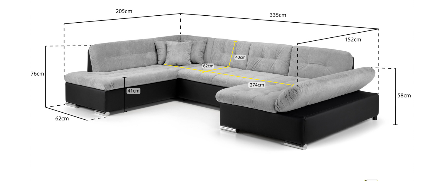 - ใDIMENSIONSใLength 335x205x152 cm – Depth 62 cm – Height 76 cm – Double Sofabed Sleeping Area 302x128 cm (more measurements are in the sofa dimensions image)