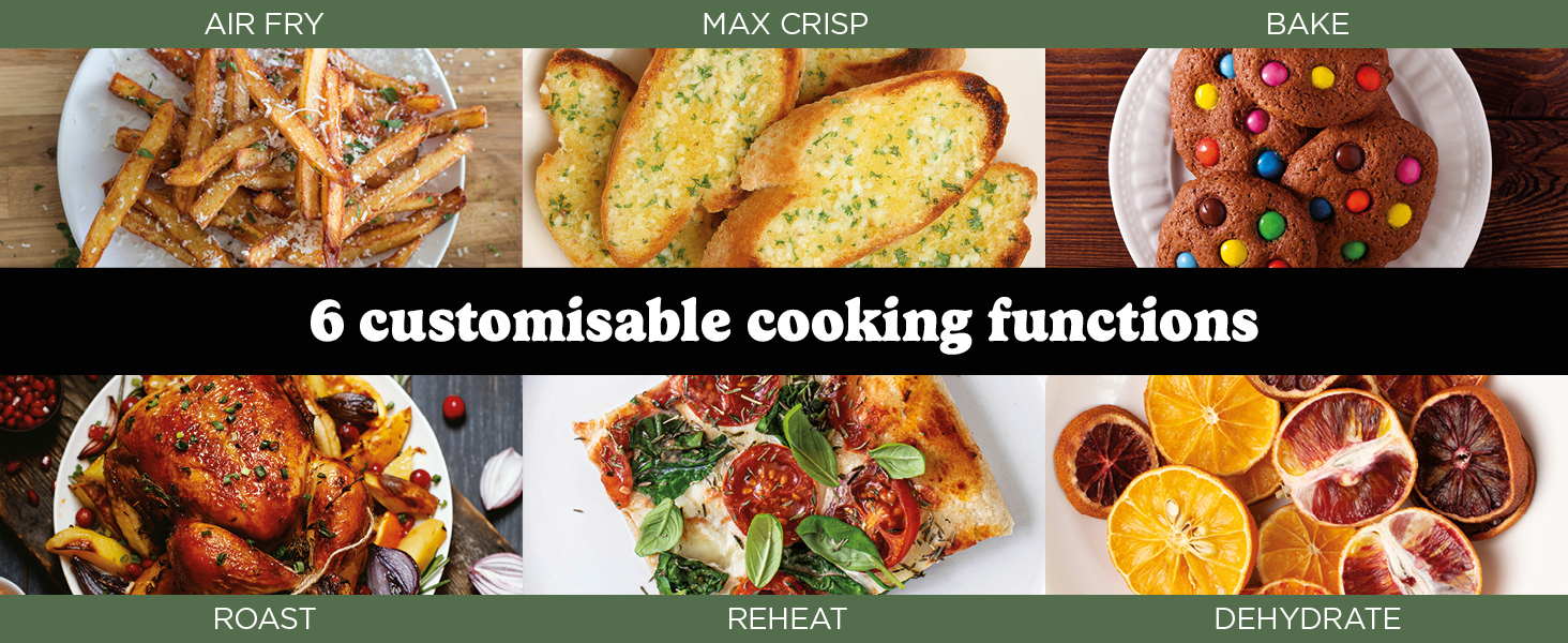 | Special Features | 6 Cooking Functions, Air Fry, Max Crisp, Roast, Bake, Reheat & Dehydrate, 2 independent cooking zones, 2 racks, Dishwasher Safe Parts |