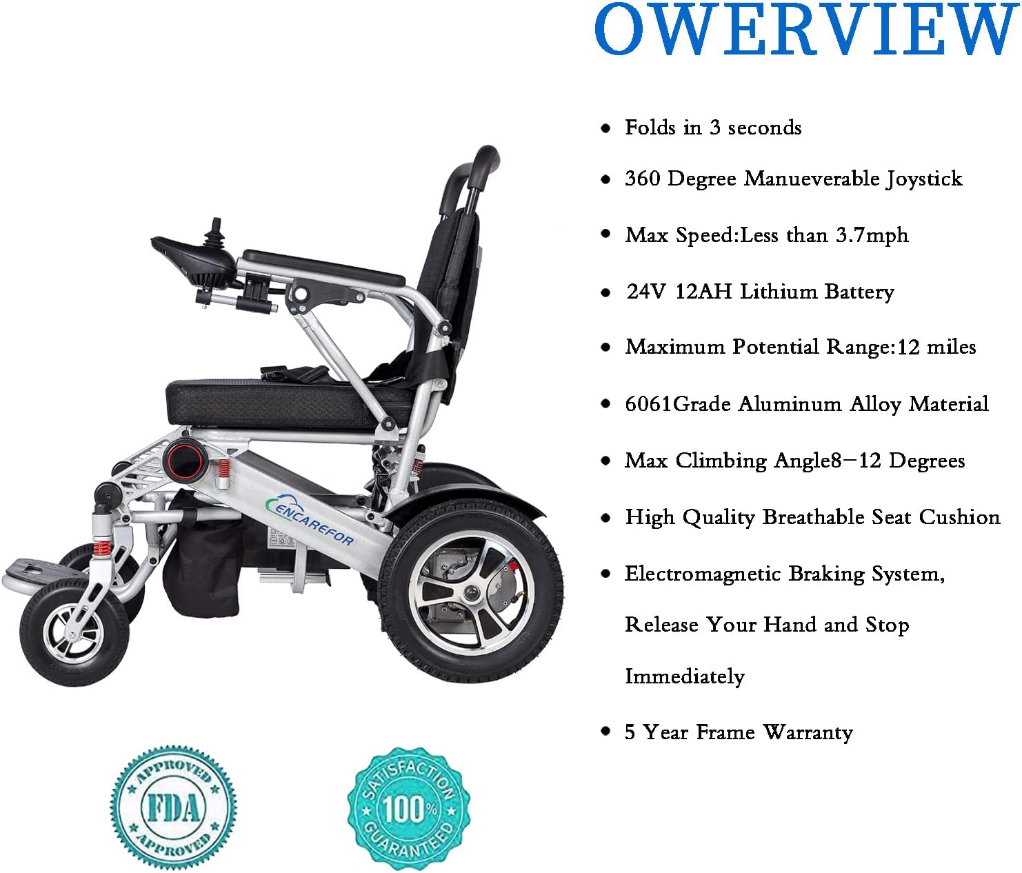 - Powerful: Encarefor lightweight foldable electric wheelchair equipped with 24V12AH lithium battery, the maximum driving range is 12 miles, the use of detachable battery, easy to disassemble, meet a variety of charging methods, enjoy the fun of traveling