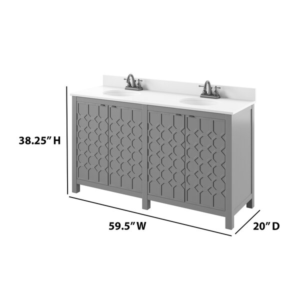 This freestanding double vanity brings a streamlined silhouette and geometric pattern to your powder room. It has an engineered wood base and a stone backsplash and countertop. Its two oval, undermount sinks are made from stone in a white finish. Store bathroom essentials in its two soft-close, double-door cabinets, each with a built-in interior shelf. This vanity features a glam, playful design of repeating octagons across its cabinet doors – reminiscent of honeycomb. It measures 59.5” wide and 20'' deep, with cabinet hardware included and the faucets and mirror sold separately.